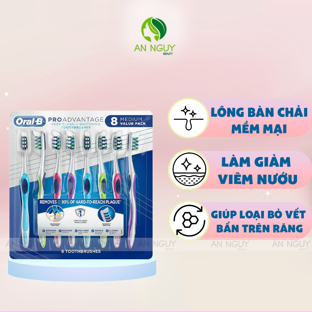 - Bàn Chải Oral-B Proadvantage Deep Clean + Whitening có lông bàn chải CrissCross được thiết kế theo các hướng ngược nhau giúp quét sạch mảng bám.