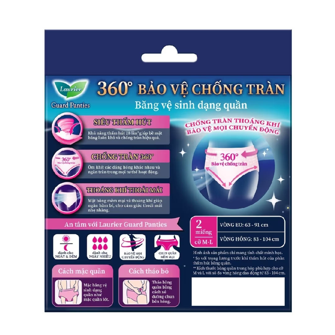 - 360 độ chống tràn: Thiết kế băng quần tối ưu giúp ôm khít các dáng hông khác nhau và ngăng tràn trong mọi tư thế hoạt động.