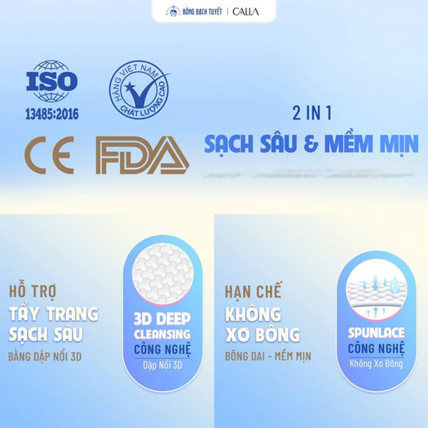 - Bông Tẩy Trang Calla Skin Cleansing Cotton 3D Round (Tròn 3D) Nguyên Liệu 100% Bông Xơ Thiên Nhiên: Sử dụng bông xơ thiên nhiên nhập khẩu từ Mỹ, mang lại độ mềm mại và dịu nhẹ cho da.
