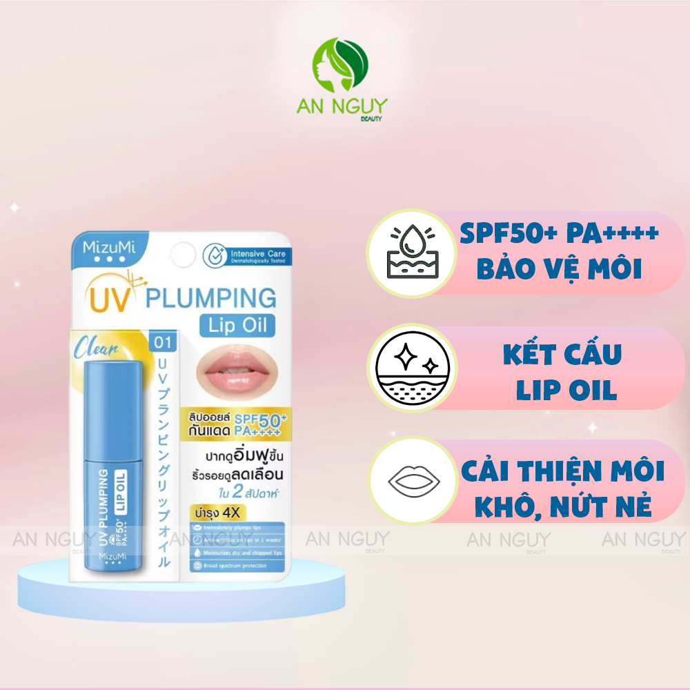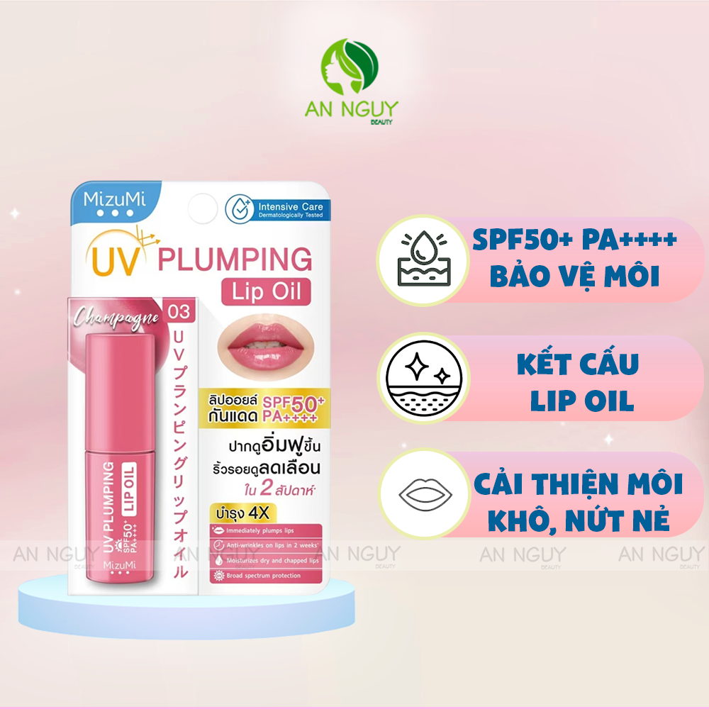 - Dầu Dưỡng Môi Chống Nắng Mizumi UV Plumping Lip Oil Rouge mang lại hiệu ứng căng mọng ngay khi thoa, đồng thời bảo vệ môi tối ưu trước tia UV với chỉ số SPF50+ PA++++.