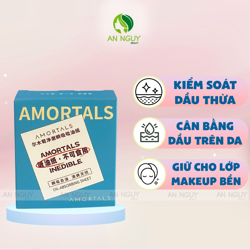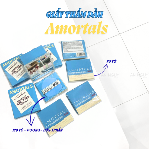 - Film Thấm Dầu Amortals Oil - Absorbing Sheet với mỗi tờ được phủ 4g bột siêu mịn giúp hút dầu nhanh mà không lem lớp trang điểm.