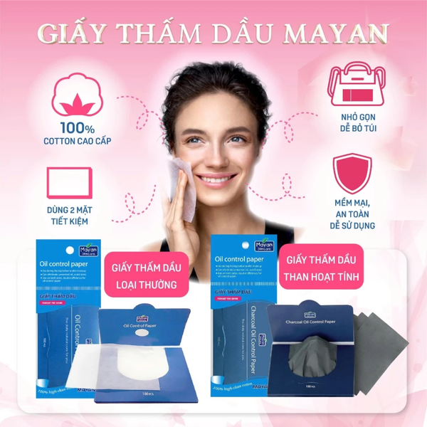 - Giấy Thấm Dầu Mayan Oil Control Paper Kiểm Soát Dầu giúp hút sạch lượng dầu thừa, giảm bóng nhờn trên da mà không làm trôi lớp trang điểm.