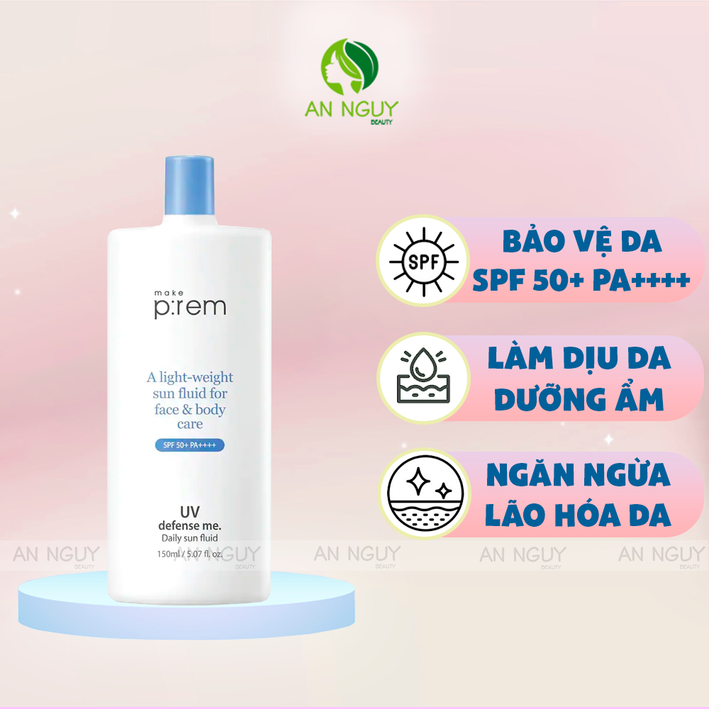 - Kem chống nắng Make P:rem UV Defense Me. Daily Sun Fluid là sản phẩm kem chống nắng dạng lai đến từ thương hiệu Make P:rem Hàn Quốc. Công thức với sự kết hợp giữa màng lọc vô cơ và hữu cơ, giúp bảo vệ toàn diện cho da mặt và cơ thể tránh khỏi tác hại của tia UVA / UVB