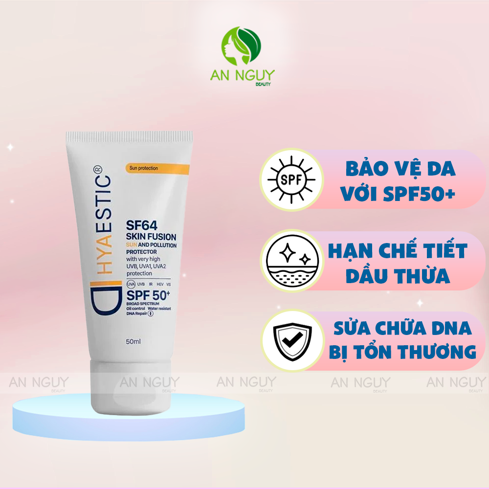 - Kem Chống Nắng Hyaestic SF64 Skin Fusion Sun And Pollution Protector Bảo Vệ Da với thành phần màng lọc chống nắng chiếm 25% trong bảng thành phần sẽ tối ưu hóa khả năng chống nắng, bảo vệ làn da tối đa trước các tác động của tia UV bước sóng ngắn và dài.