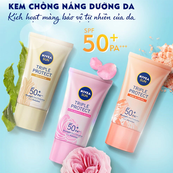 Kem Chống Nắng Nivea Triple Protect SPF50+ PA+++ 40ml với công nghệ Triple Defense cùng chỉ số chống nắng SPF50+ PA+++ giúp chống nắng tối ưu bảo vệ da dưới tia UVA, UVB, ánh sáng xanh và ô nhiễm từ môi trường. Đồng thời sản phẩm sử dụng công thức Ultra Light cho lớp chống nắng thẩm thấu nhanh vào da, không gây cảm giác nhờn rít.