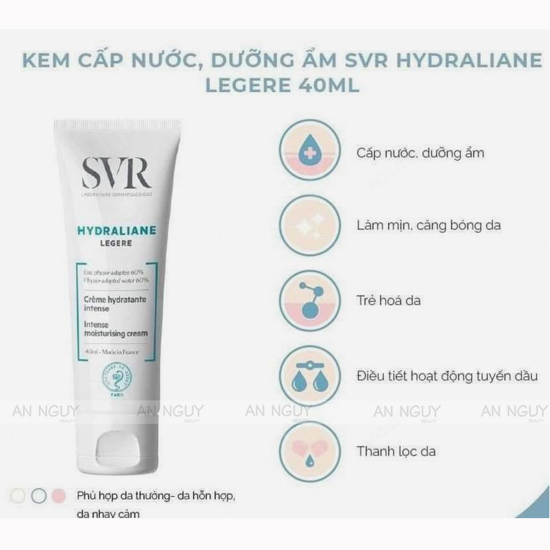 - Kem Dưỡng Ẩm SVR Cho Da Thường Đến Da Hỗn Hợp 40ml là sản phẩm kem dưỡng đến từ thương hiệu mỹ phẩm SVR của Pháp, có thể sử dụng cho da thường đến da hỗn hợp, với kết cấu dạng lotion nhẹ như lông tơ kem sẽ tan chảy vào trong da và ngay lập tức bao phủ làn da, mang lại cho bạn sắc da không bóng nhờn, sáng mịn với hiệu quả dưỡng ẩm lên đến 24 giờ.