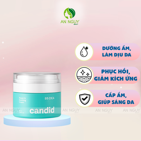 - Kem Dưỡng Candid B5 Cica Repair & Soothing Cream Dưỡng Ẩm, Làm Dịu Da chứa bộ 3 hoạt chất Vitamin B5, Niacinamide và 5-Cica: giúp tăng cường khả năng tái tạo tế bào da, phục hồi làn da tổn thương.