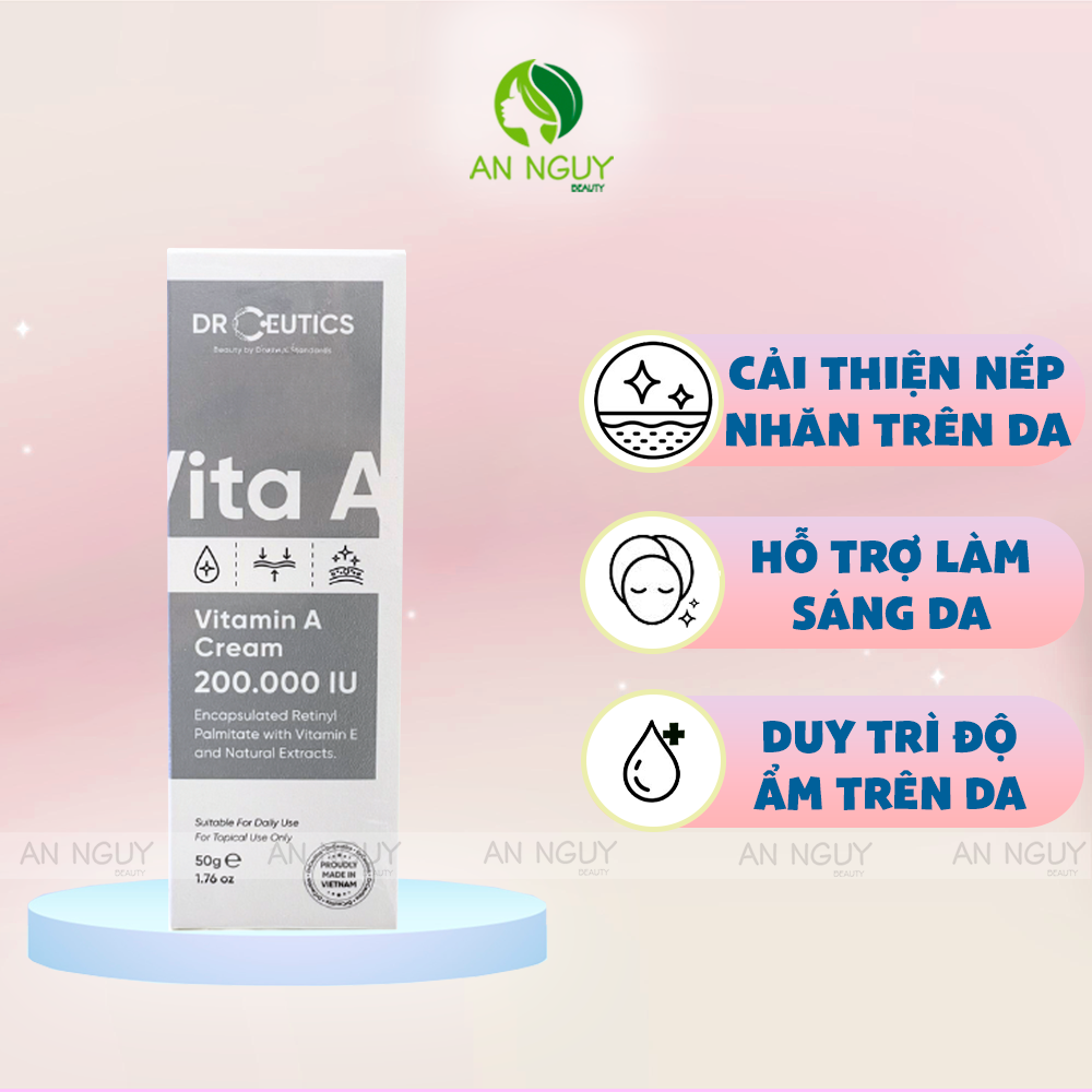 - Kem Dưỡng DrCeutics Vitamin A Cream 200.000 IU Làm Sáng Da được bổ sung thêm các chiết xuất thiên nhiên, Vitamin E,.. để tăng khả năng cấp ẩm và làm mềm da, giúp da mịn màng, căng mướt.