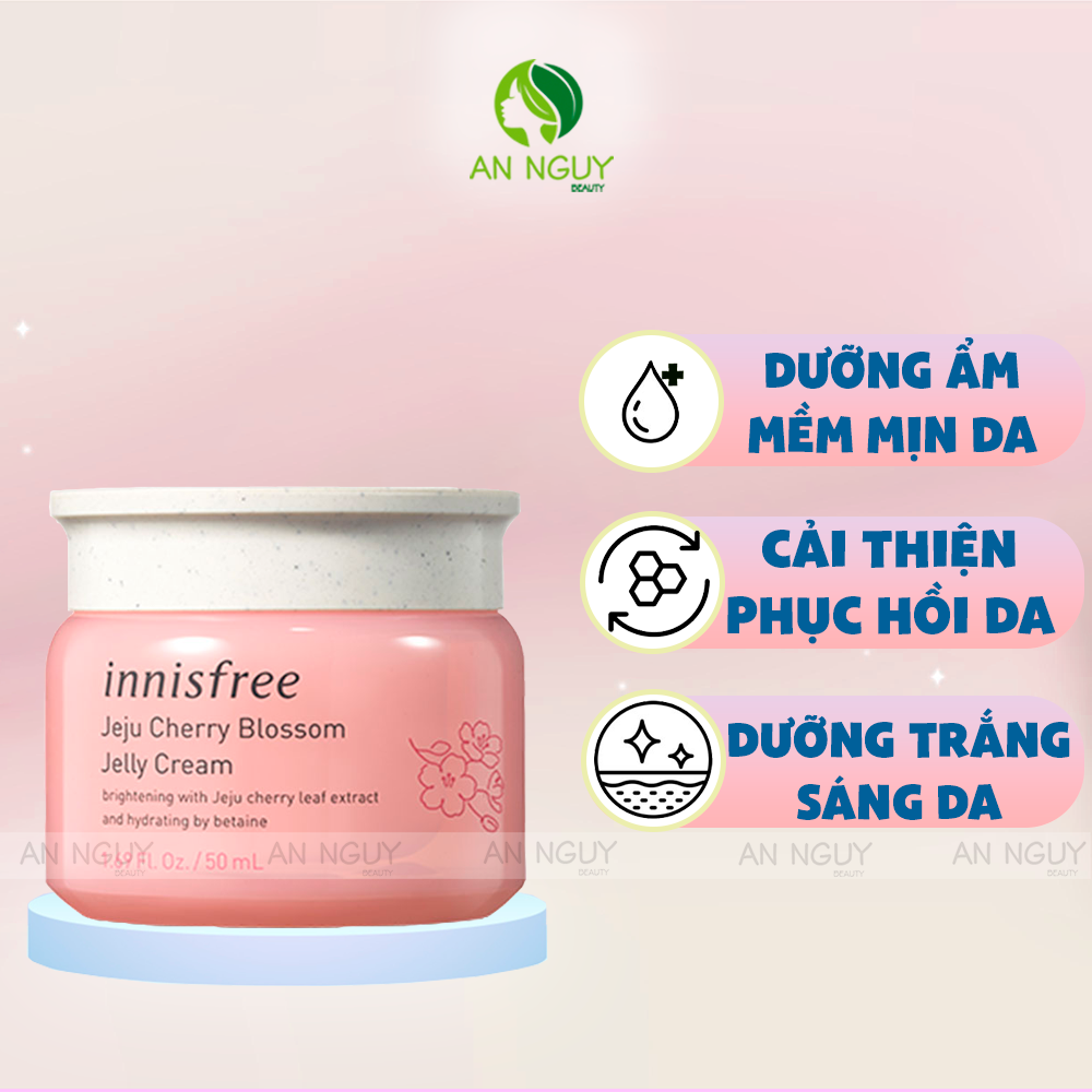 - Kem dưỡng Innisfree Jeju Cherry Blossom Jelly Cream được hãng ra mắt năm 2009 với tác dụng tuyệt vời trong việc dưỡng ẩm cho da, cải thiện bề mặt da giúp da láng mịn, trắng hồng, ẩm mượt suốt một ngày dài.