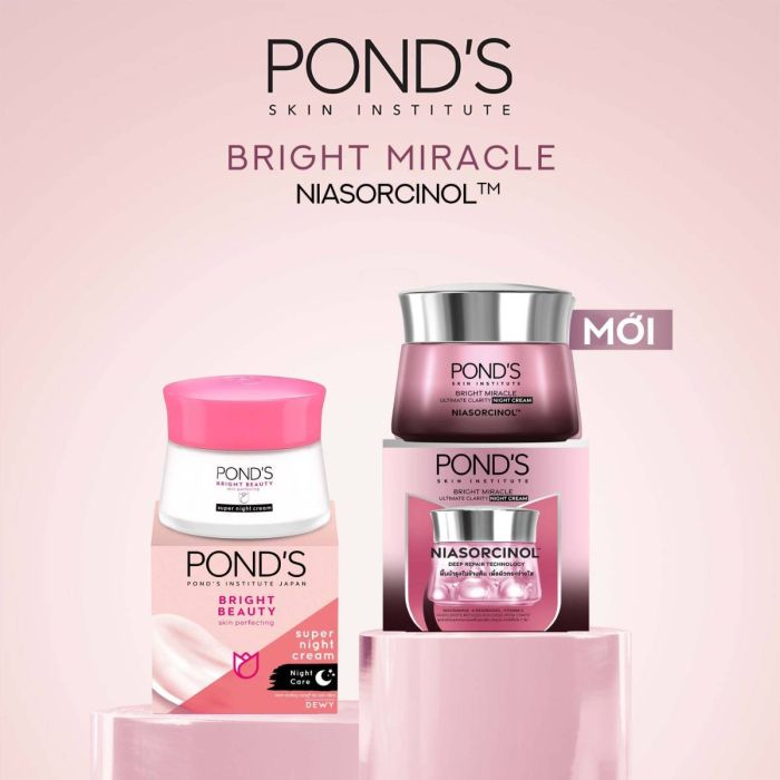 - Kem Dưỡng Pond's Bright Miracle Ultimate Clarity Cream Dưỡng Sáng Da với phức hợp độc quyền NIASORCINOL TM dưỡng sáng vượt trội hơn các sản phẩm có chứa đến những 10% Niacinamide giúp làm sáng và mờ các vết thâm sạm, hỗ trợ dưỡng da sáng mịn đều màu từ sâu bên trong.