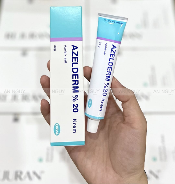 - Kem Giảm Mụn Thâm Azelderm 20% Krem là sản phẩm dược mỹ phẩm xuất xứ từ Thổ Nhĩ Kỳ, chứa hoạt chất chính là Azelaic Acid 20% chuyên dùng để điều trị mụn trứng cá và làm mờ các vết thâm sau mụn.