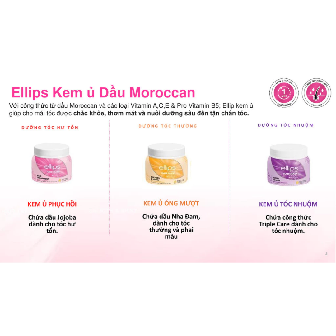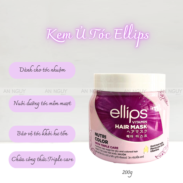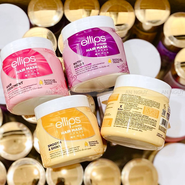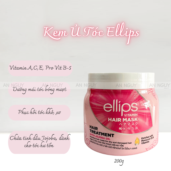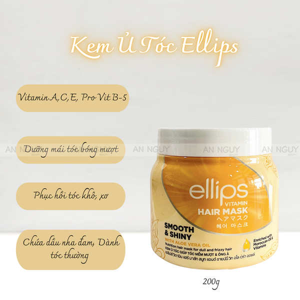 - Kem Ủ Tóc Ellips có thành phần Vitamin A, C, E: Nuôi dưỡng, làm bóng mượt.