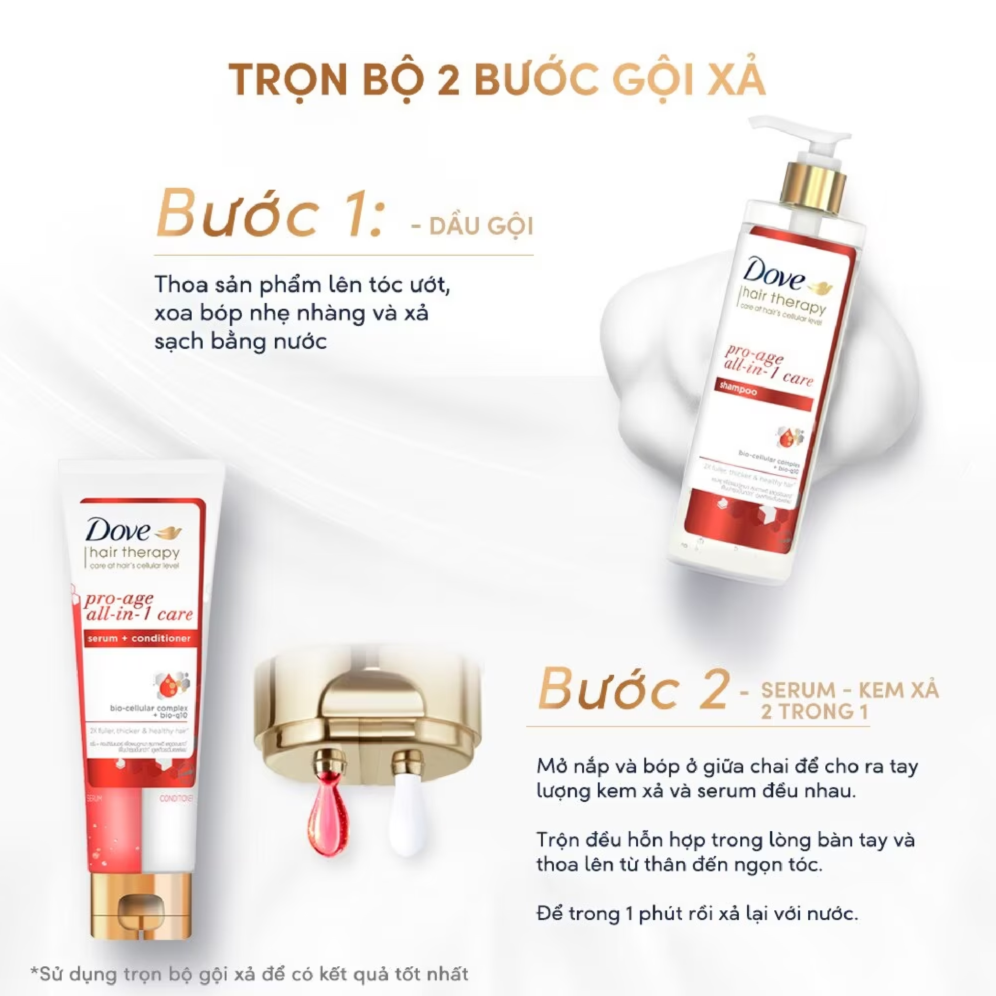- Kem Xả Dove Pro-Age All In 1 Care Serum + Conditioner Dưỡng Tóc Phồng Dày được sản xuất với hoạt chất dưỡng Bio-Q10 và công nghệ Bio-cellular complex nuôi dưỡng tóc từ cấp tế bào, mang đến mái tóc chắc khoẻ, suôn mượt, hỗ trợ phục hồi hư tổn.