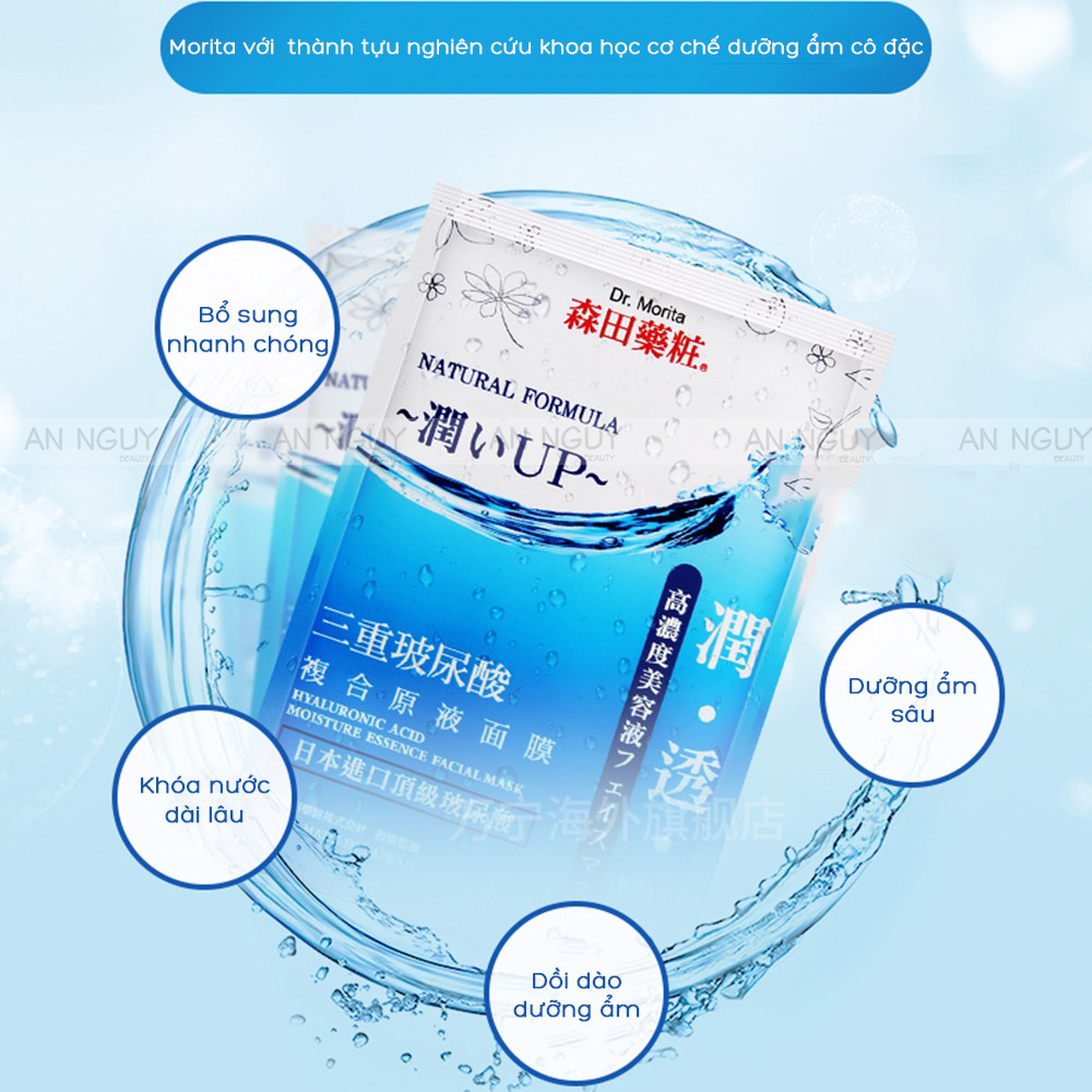 - Mặt nạ cấp ẩm Dr.Morita Hyaluronic Acid Moisture Essence Facial Mask với thành phần Hyaluronic Axit có nồng độ cao giữ ẩm nhiều tầng, thâm nhập sâu dưới da, cấp ẩm giữ nước.