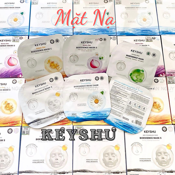 - Mặt Nạ Dưỡng Da Keyshu Bioessence Mask nổi bật với các thành phần thiên nhiên như: rau má, cúc la mã, hành tím, vitamin c... giúp cung cấp các dưỡng chất nuôi dưỡng làn da dịu nhẹ, mềm mịn.