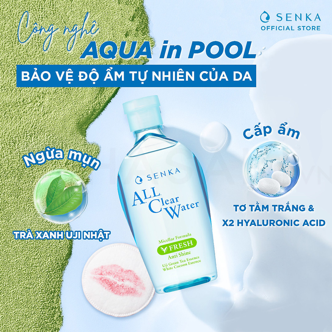 #Nước Tẩy Trang Senka All Clear Water Fresh Anti Shine với công nghệ Micellar Nhật Bản, giúp làm sạch lớp trang điểm và bụi bẩm bám sâu trên da, cũng như loại bỏ lượng dầu thừa.