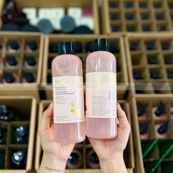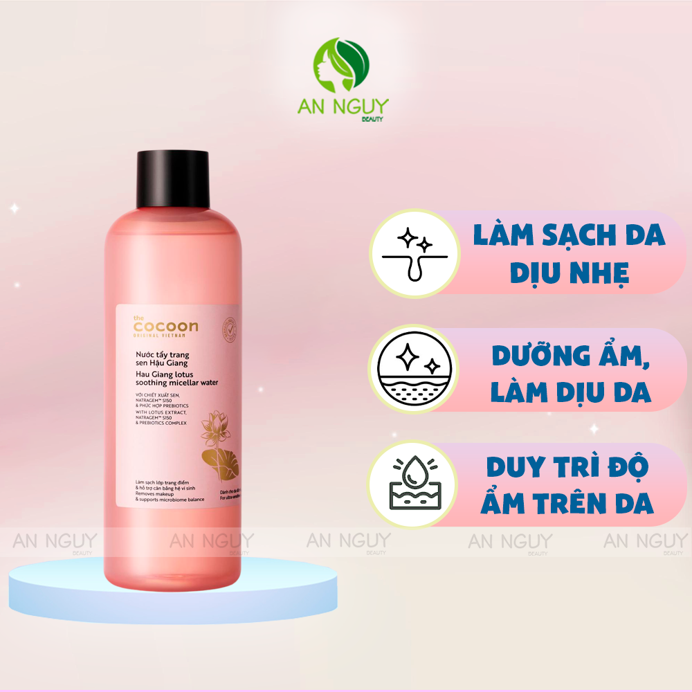 - Nước Tẩy Trang Cocoon Sen Hậu Giang Lotus Soothing Micellar Water Cho Da Rất Nhạy Cảm thuộc thương hiệu mỹ phẩm thuần chay đến từ Việt Nam. Với chiết xuất sen Hậu Giang, kết hợp công nghệ micellar và NatraGem™ S150, phức hợp prebiotics cùng các hoạt chất làm dịu chuyên sâu giúp làm sạch hiệu quả lớp trang điểm, bụi bẩn, dầu thừa nhưng vẫn duy trì độ ẩm tự nhiên, bảo vệ hàng rào độ ẩm và hỗ trợ cân bằng hệ vi sinh cho da.