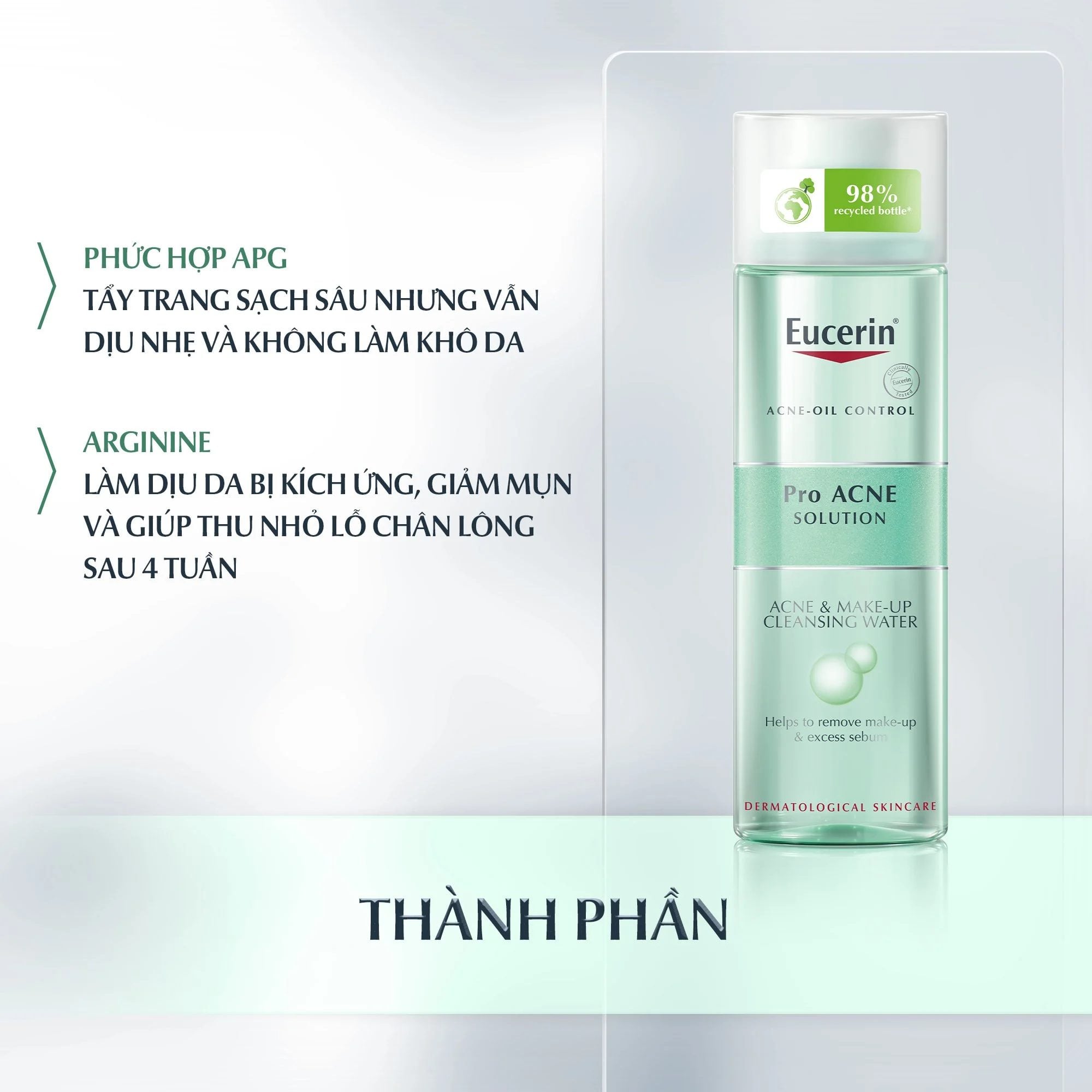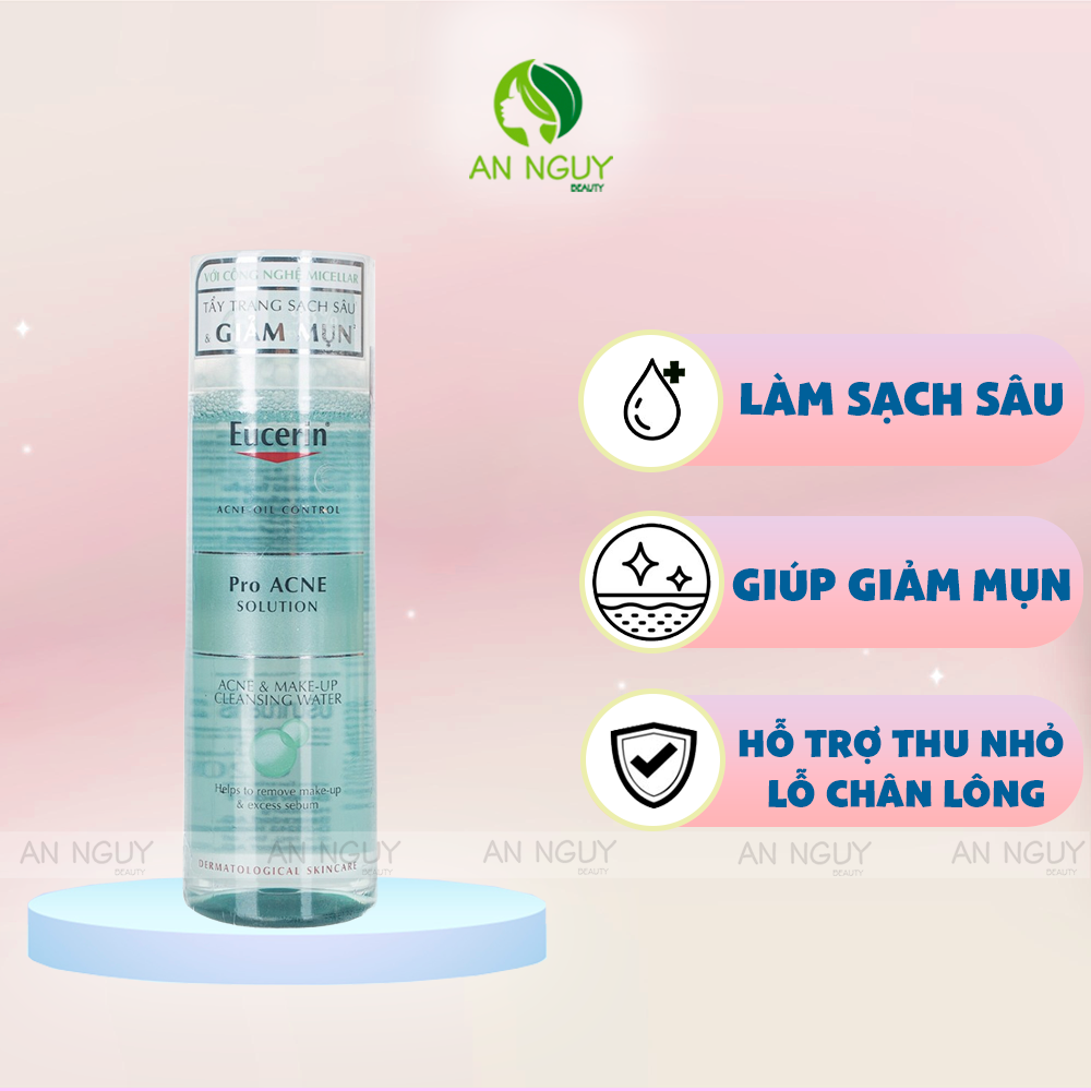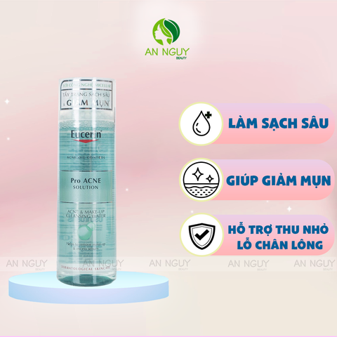 - Nước Tẩy Trang Eucerin Dành Cho Da Mụn đến từ thương hiệu dược mỹ phẩm Eucerin của Đức là dòng tẩy trang dành cho mọi loại da, đặc biệt là da mụn, với khả năng làm sạch nhẹ nhàng và hiệu quả lớp trang điểm & dầu nhờn trên da.