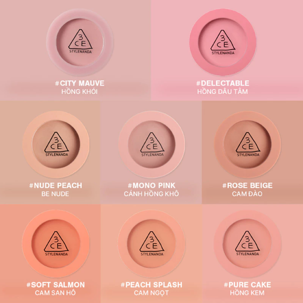 - Phấn Má Hồng 3CE Mood Recipe Face Blush là má hồng thuộc thương hiệu 3CE với kết cấu phấn mềm mịn cùng bảng màu tông ấm hài hòa, tươi tắn tạo điểm nhấn cho gương mặt bạn thêm rạng rỡ, đáng yêu tỏa sáng thu hút mọi ánh nhìn.