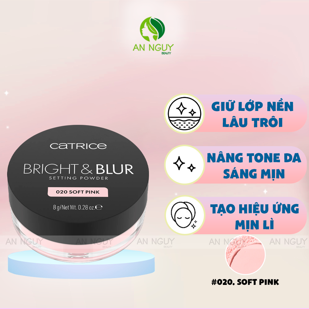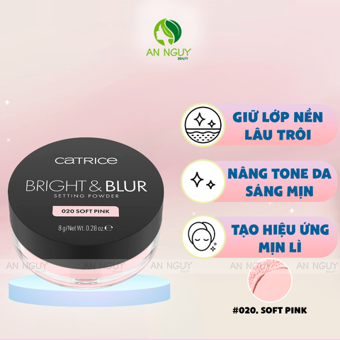 - Phấn Phủ Catrice Bright & Blur Setting Powder là phấn phủ dạng bột mỏng nhẹ, hỗ trợ làm mờ lỗ chân lông – cố định lớp nền – nâng tone căng bóng tự nhiên.