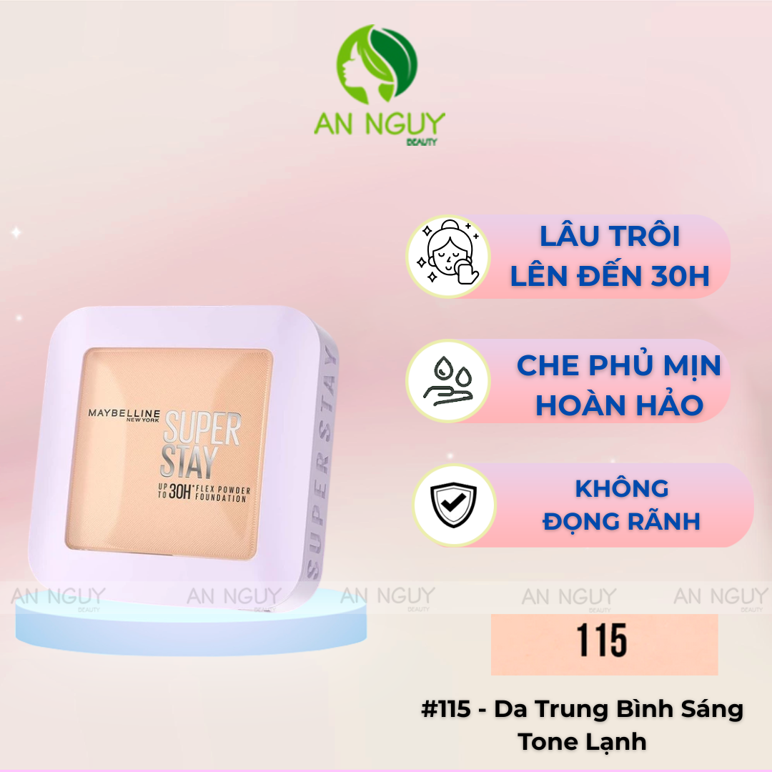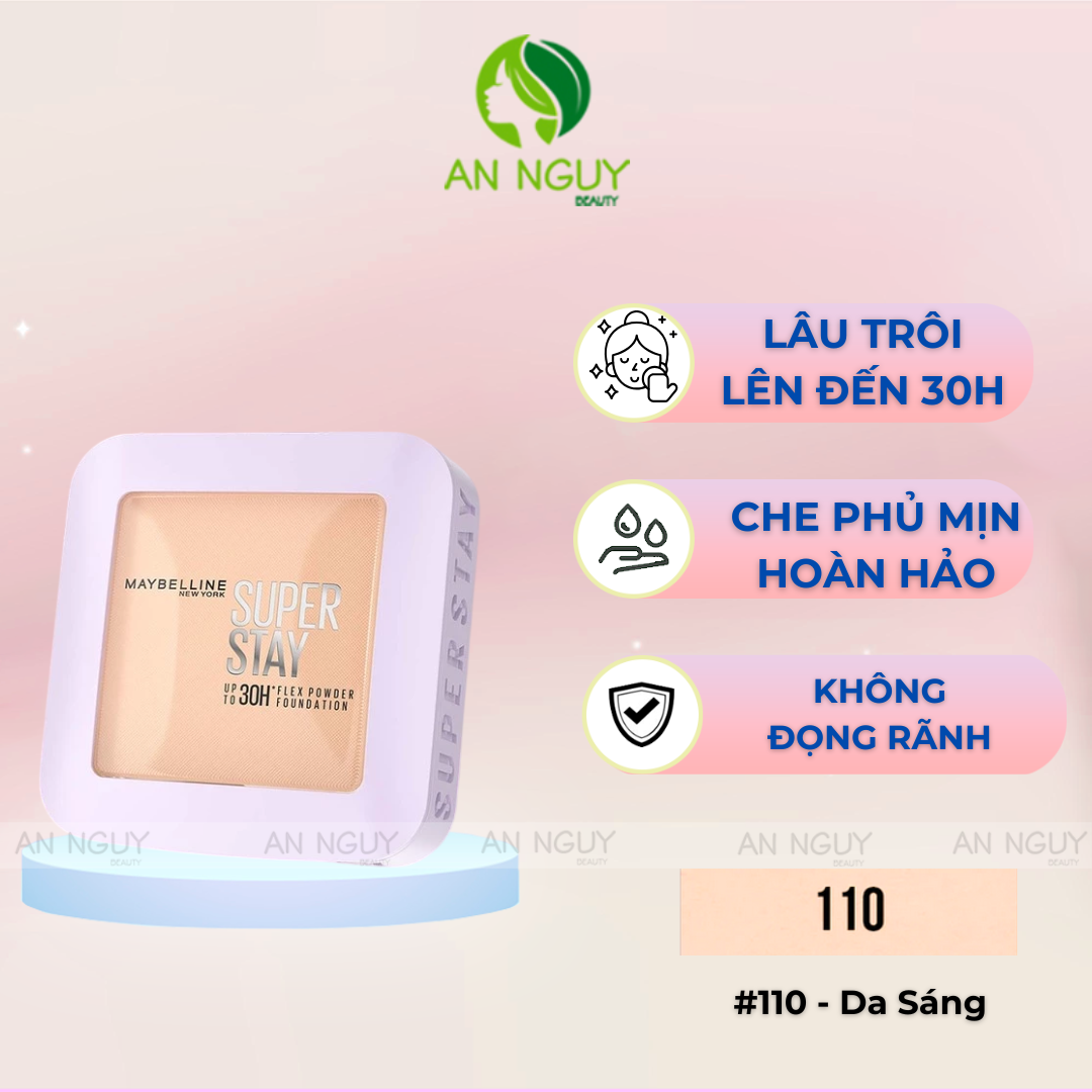 - Phấn Phủ Dạng Nén Maybelline Super Stay Up To 30H Flex Powder Foundation là phấn phủ trang điểm dạng nén, lâu trôi, che phủ khuyết điểm và lỗ chân lông cho lớp nền mịn mượt, đều màu, không vón cục trên da. Đồng thời giúp bảo vệ da chống nắng.
