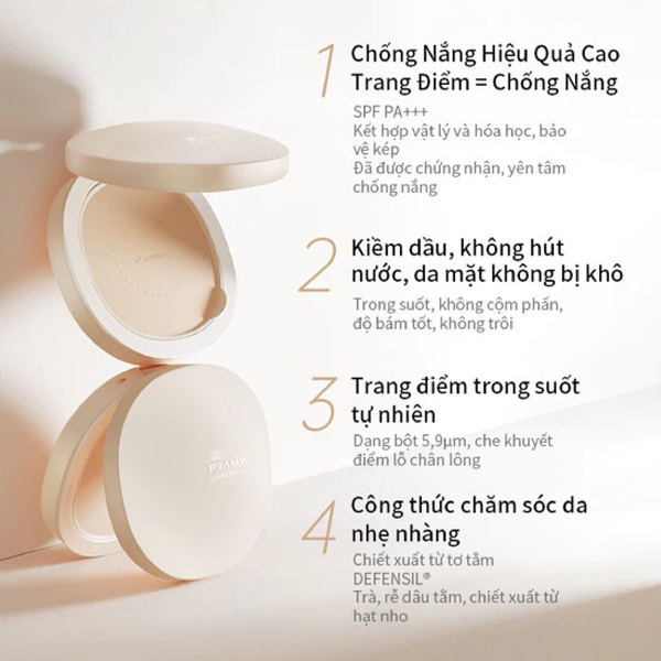 - Phấn Phủ Dạng Nén Pramy Sunscreen Pressed Powder SPF40 PA+++ Chống Nắng, Kiềm Dầu cho lớp trang điểm lâu trôi không bóng dầu với hệ thống chống nắng hiệu quả cao, ngăn ngừa tia cực tím toàn diện.