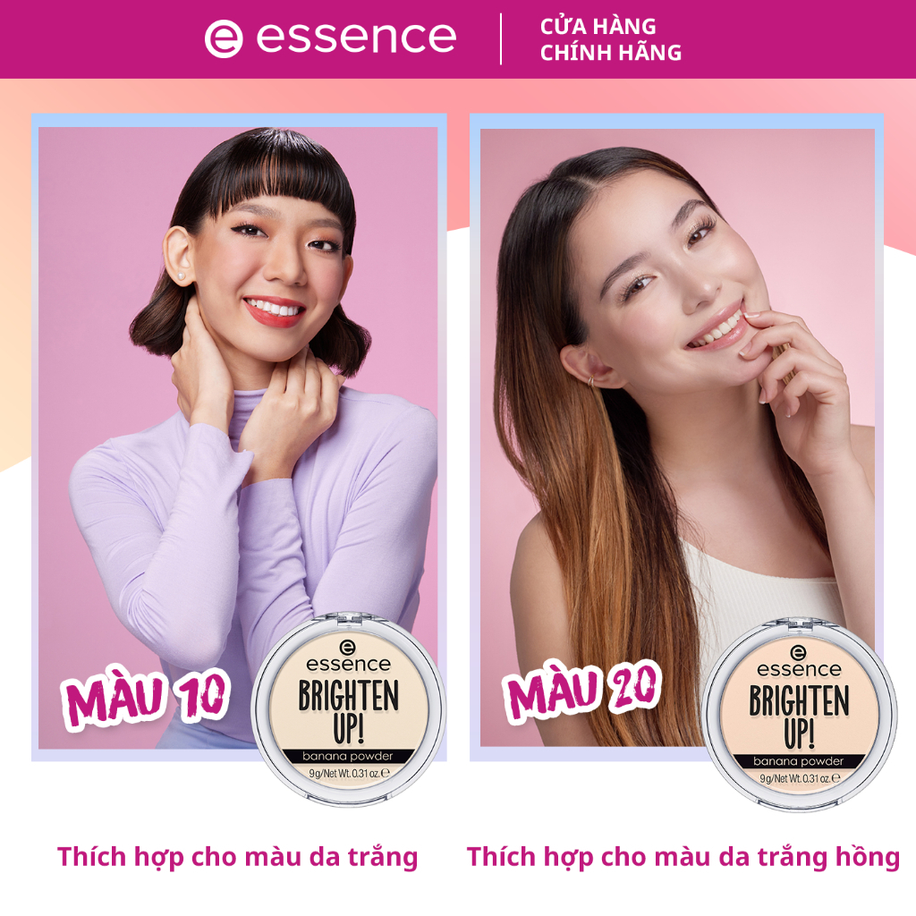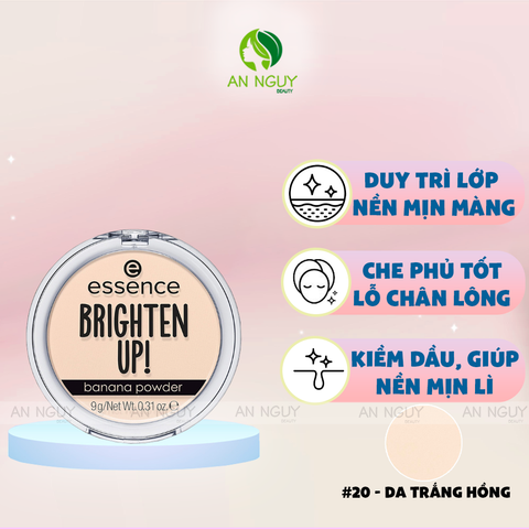 - Phấn Phủ Essence Brighten Up Banana Powder với công thức đặc biệt, sản phẩm giúp kiểm soát bóng nhờn nhờ khả năng kiềm dầu lên đến 16H, giữ lớp trang điểm lâu trôi suốt cả ngày dài.