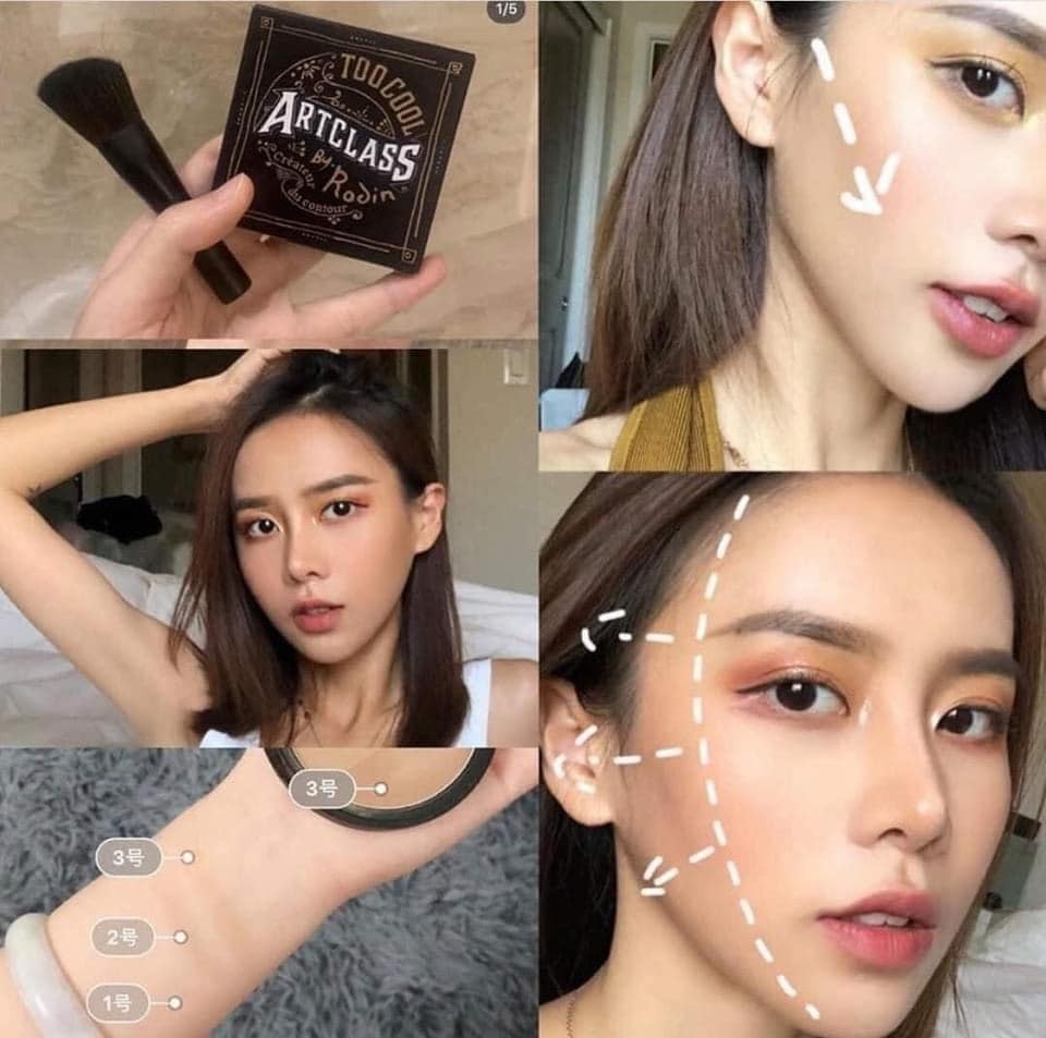 + Bước 1 - Gò má: Dùng phấn tạo khối có tông màu nâu sáng (đậm hơn màu phấn nền khoảng 2 tông màu), lấy cọ phấn to tán đều hai bên gò má. Nếu muốn xác định chính xác vị trí gò má của mình bạn chỉ cần hóp má lại, phần xương nhô lên cao nhất trên khuôn mặt chính là vị trí bạn cần tìm. Chú ý chỉ tán phấn cho đến khoảng giữa mắt thẳng xuống để tránh cho khuôn mặt bạn nhìn quá “xương xẩu”.