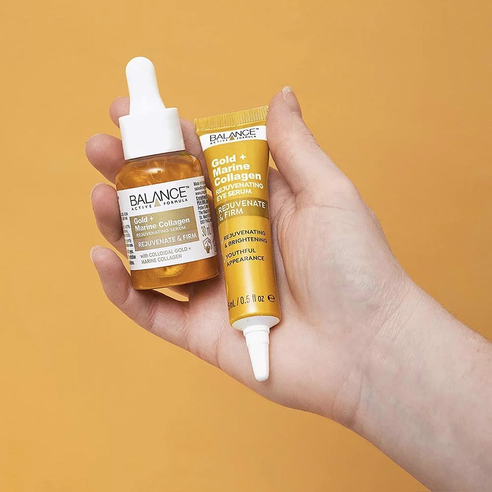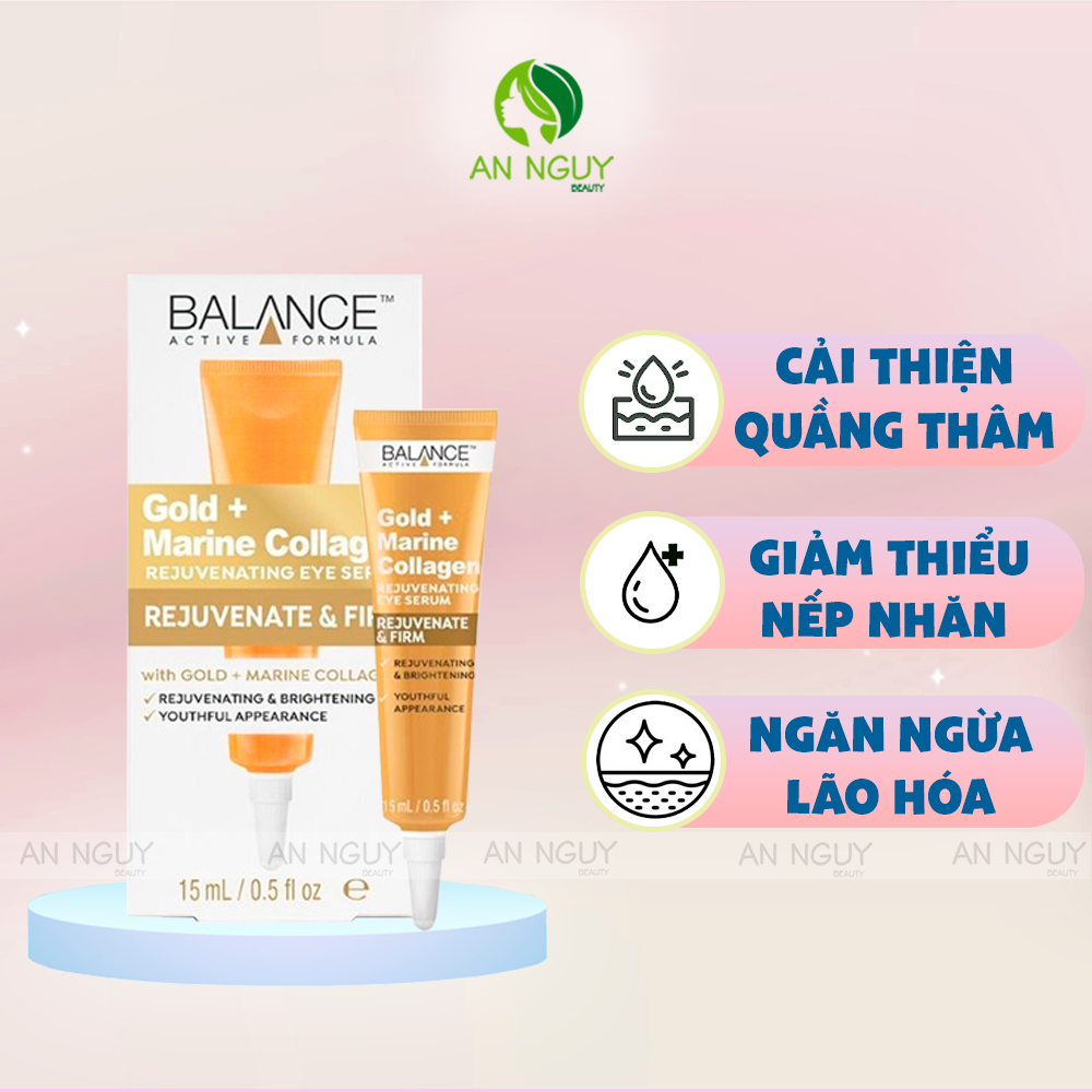 - Balance Active Formula Gold + Marine Collagen Rejuvenating Eye Serum là sản phẩm dưỡng vùng da mắt được chế tạo với thành phần collagen tự nhiên, giúp tăng cường cấu trúc da và khôi phục sự mịn màng, đầy đặn cho vùng da xung quanh mắt.