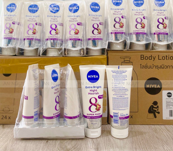 - Serum Dưỡng Thể Nivea Extra Bright Night Nourish Super Food 50X Vitamin C Body Serum với công thức tăng cường 10 dưỡng chất quý giá, chứa hàm lượng Vitamin C cô đặc gấp 50 lần giúp dưỡng sáng da hiệu quả chuyên biệt dành cho ban đêm.
