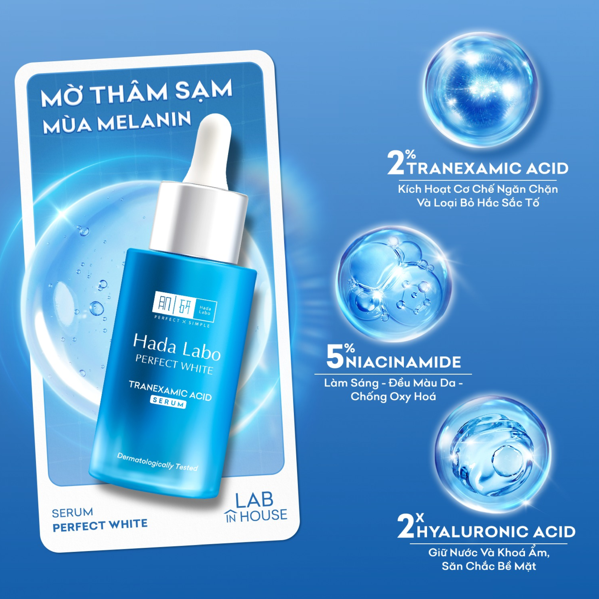 - Serum Dưỡng Trắng Hada Labo Perfect White Tranexamic Acid Serum Giảm Thâm Sạm, Mờ Thâm 30ml với thành phần chính 2% Tranexamic Acid kết hợp Vitamin C và E, 5% Niacinamide giúp mờ thâm sạm, dưỡng da sáng khỏe, rạng rỡ sau 7 ngày.