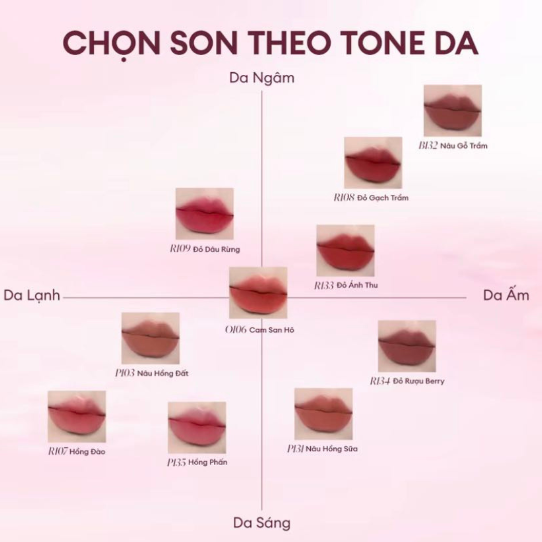 - Phiên bản nâng cấp với tone màu trendy cho đôi môi xinh căng mịn màng với màu son không kén da và dễ dàng phù hợp với nhiều tone make-up.