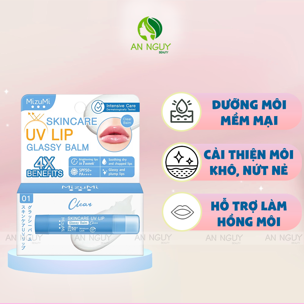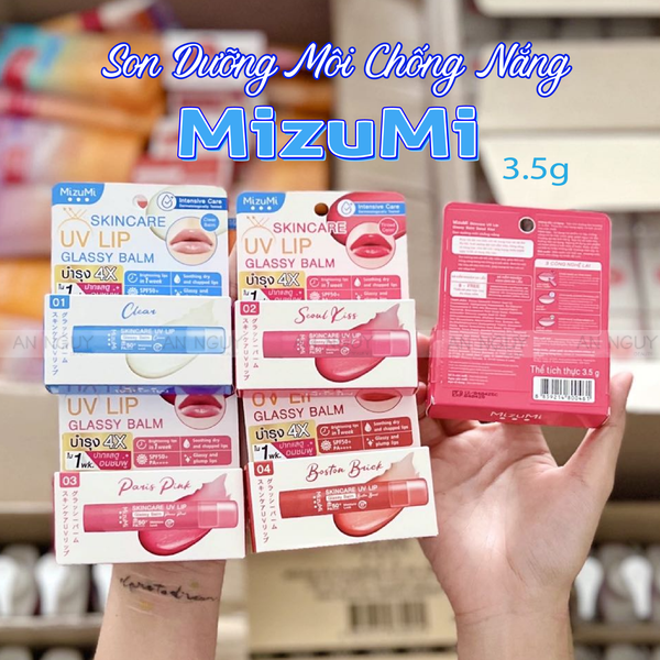 - Son Dưỡng Môi Chống Nắng MizuMi Skincare UV Lip Glassy Balm với chỉ số chống nắng SPF50+ và PA++++ giúp bảo vệ môi khỏi tác hại của tia UVA và UVB, tương đương kem chống nắng phổ biến.