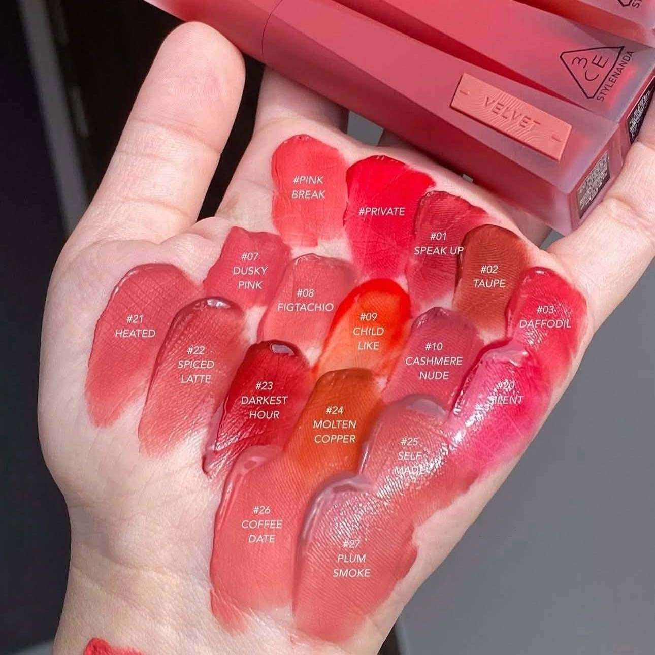 - Son Kem Nhung 3CE Stylenanda Velvet Lip Tint Plush là phiên bản cải tiến của dòng kem lì huyền tho thoại với Velvet Lip Tint thiết kế sang xịn hơn, chất son mướt mịn hơn, lên màu chuẩn đẹp mê ly.