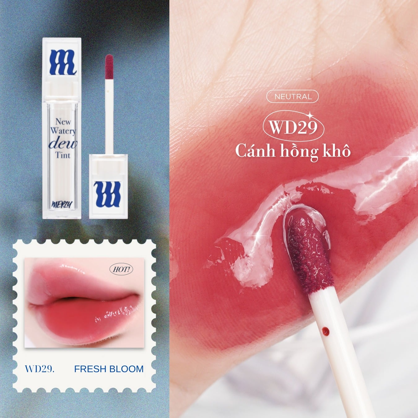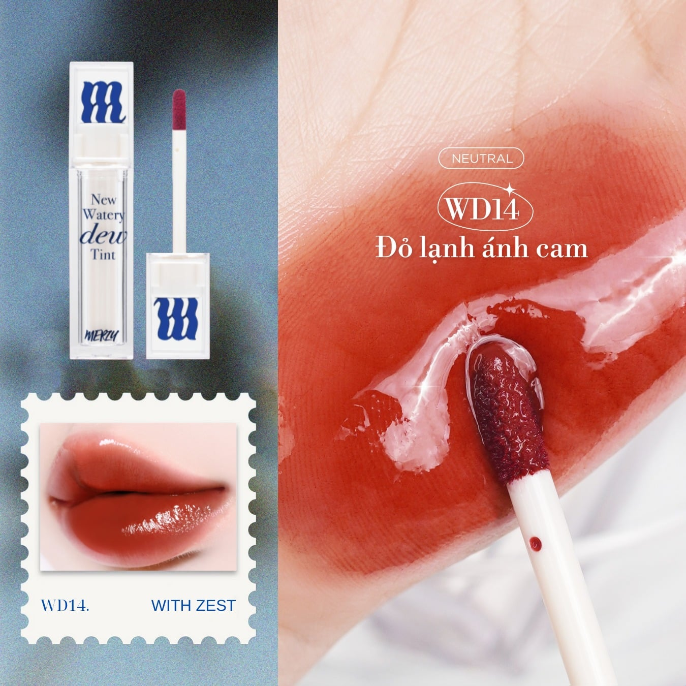 - Son Tint Bóng Merzy New Watery Dew Tint Ẩm Mịn, Lâu Trôi Cho Đôi Môi Căng Mọng là son tint đến từ thương hiệu Merzy. Lấy cảm hứng từ tinh thần Old Money, thiết kế vỏ son tối giản mà sang trọng, nổi bật với logo chữ M được nhấn nhá tinh tế nơi phần nắp.