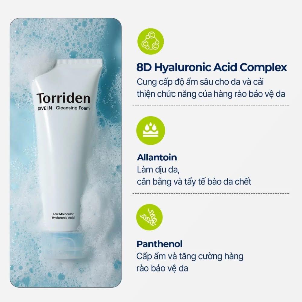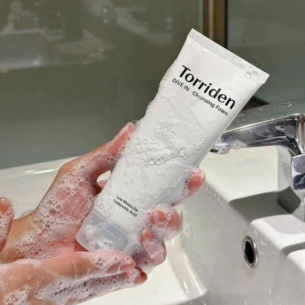 - Sữa Rửa Mặt Torriden DIVE-IN Low Molecular Hyaluronic Acid Cleansing Foam giúp làm sạch sâu, nhẹ nhàng và tạo bọt dưỡng ẩm cho da.