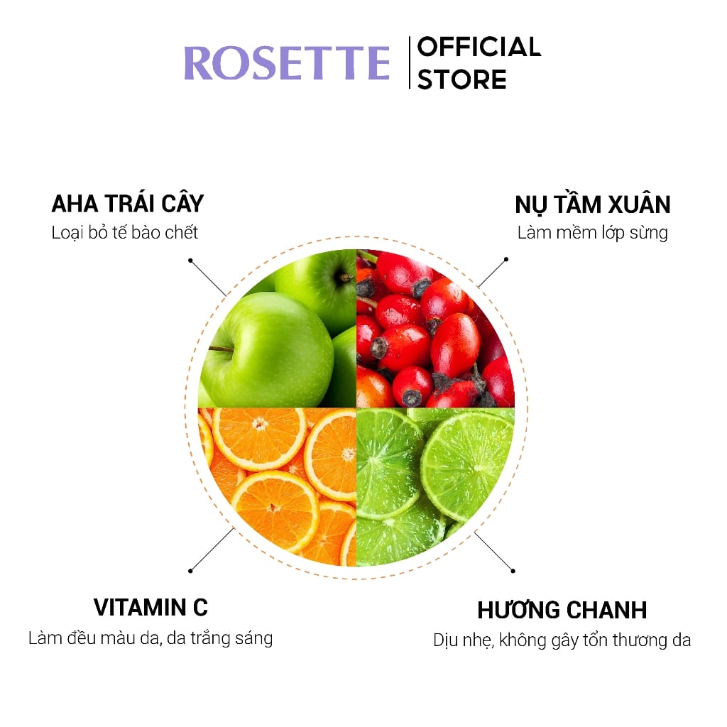 - Với công thức chung có chứa AHA chiết xuất từ 3 loại axit trái cây tự nhiên giúp làm mềm lớp sừng, loại bỏ các tế bào chết và xỉn màu, cho lỗ chân lông luôn được thông thoáng.