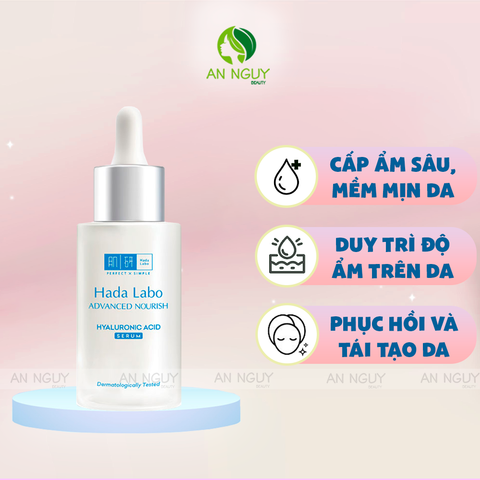 - Tinh Chất Cấp Ẩm Hada Labo Advanced Nourish Hyaluronic Acid Serum chứa 2% hệ 7 loại Hyaluronic Acid (HA, Super HA, Nano HA, Fermented HA, Binding HA, Penetrating HA, 3D HA) và 12 loại Amino Acid giúp nuôi dưỡng làn da ẩm mượt suốt 48H, đồng thời cải thiện nếp nhăn, kháng viêm, làm dịu da hiệu quả.