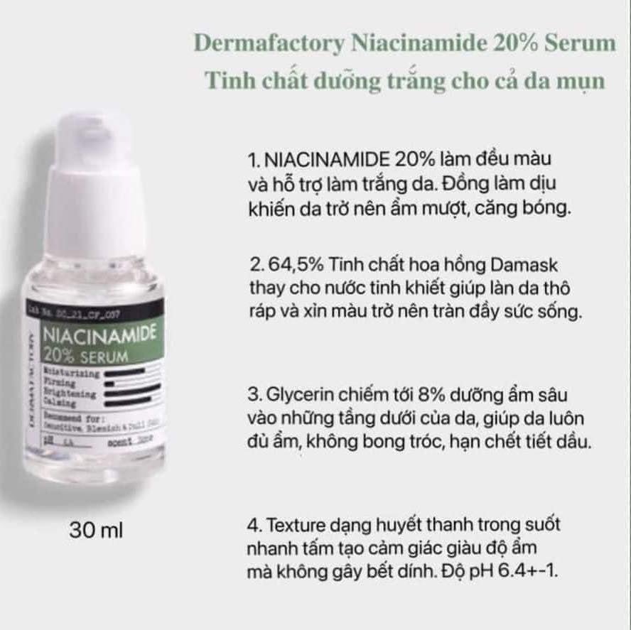 - Niacinamide 20% dẫn xuất vitamin B3 tan trong nước, giúp kiểm soát bã nhờn, thu nhỏ lỗ chân lông, giảm thâm mụn một cách hiệu quả.
