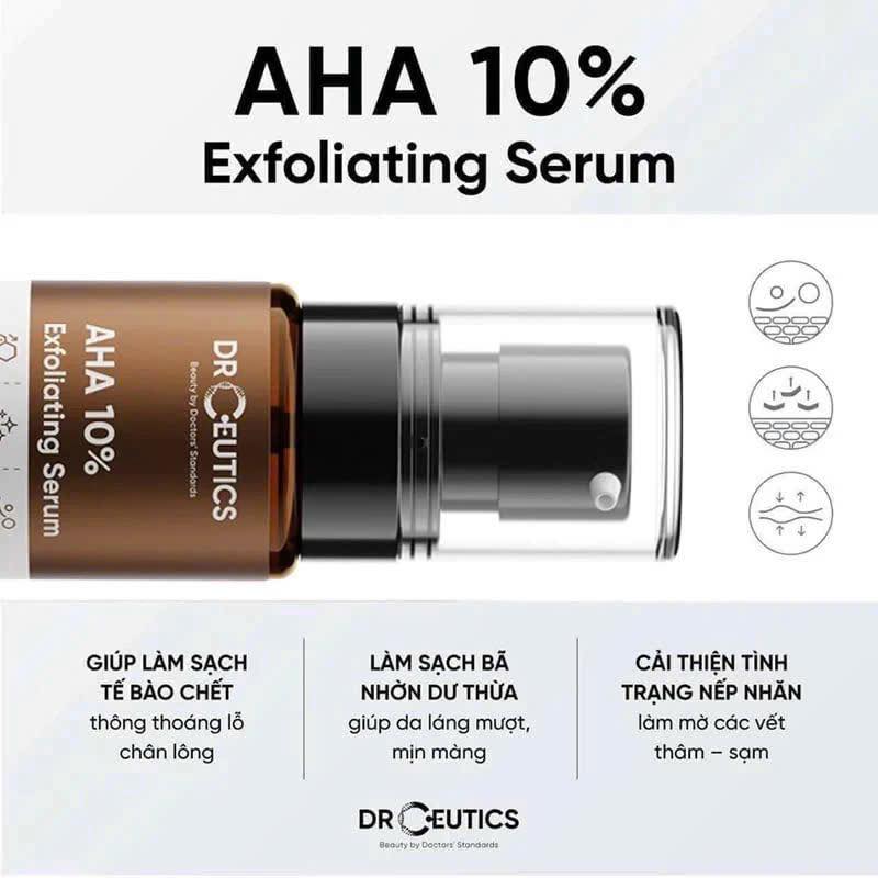 - Tinh Chất DrCeutics AHA 10% Exfoliating Serum Làm Sạch Tế Bào Chết, Sáng Da chứa phức hợp Alpha Hydroxy Acids (AHA) giúp làm sạch da chết trên bề mặt, giúp loại bỏ các tế bào già cỗi, xỉn màu, chống lão hoá, cải thiện vấn đề thâm - sạm, hỗ trợ làm sáng, giúp da đều màu và mịn màng hơn.