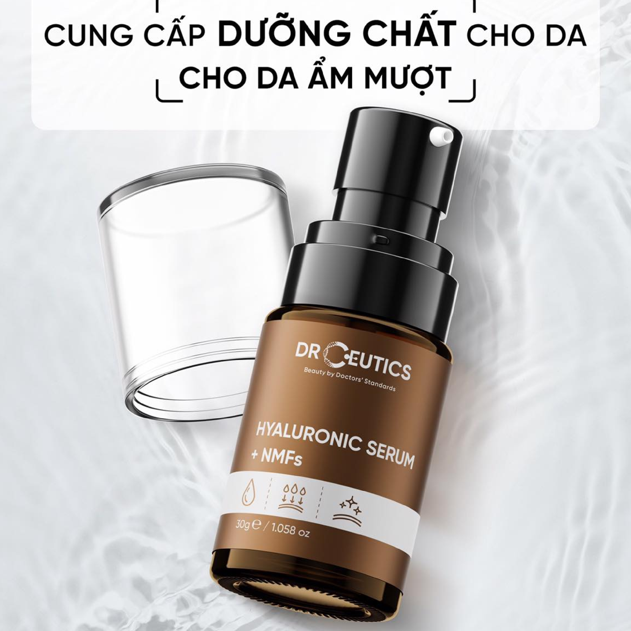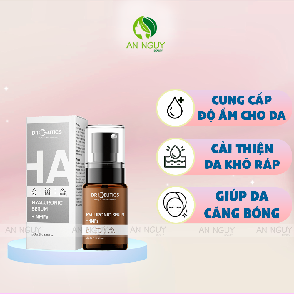 - Tinh Chất DrCeutics HA Hyaluronic Serum + NMFs Cấp Ẩm, Căng Bóng Da với thành phần chính acid hyaluronic đa tầng với tỉ lệ HA chiếm đến hơn 2,2% vơi các phân tử có kích thước siêu nhỏ giúp thâm nhập sâu vào lớp biểu bì.