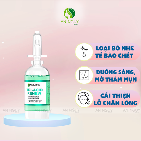 - Tinh Chất Garnier Tri-Acid Renew Skin Renewal Concentrate Serum là sự kết hợp 10% [PHA,AHA,BHA] cùng 5% [NIACINAMIDE] đây là bộ ba acid thường được ứng dụng trong điều trị da liễu, giúp làm sạch sâu, cải thiện bề mặt da, giảm thâm mụn và mang lại làn da sáng mịn hơn.