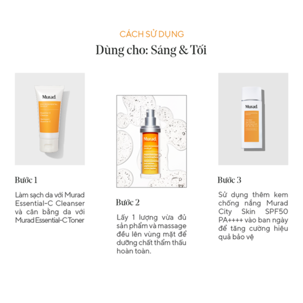 - Sử dụng thêm kem chống nắng Murad City Skin SPF50 PA++++ vào ban ngày để tăng cường hiệu quả.