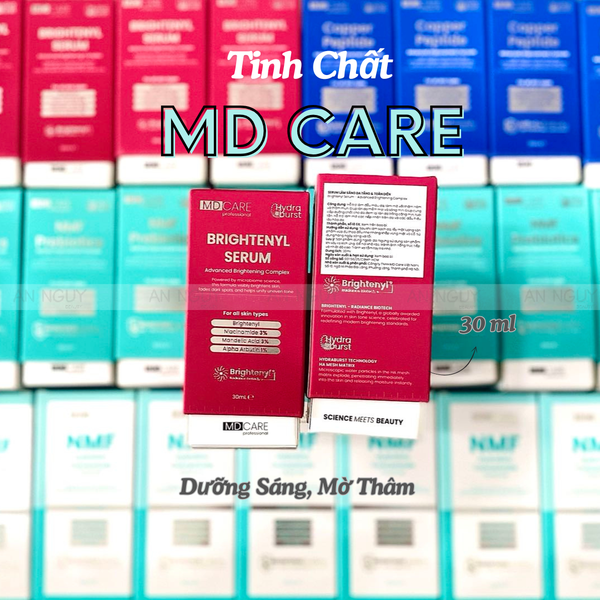 - Tinh Chất MD Care Brightenyl Serum Dưỡng Sáng, Mờ Thâm chứa Alpha-Arbutin giúp ức chế hình thành hắc tố melanin: giảm thâm nám, tàn nhang và mang lại làn da tươi sáng, rạng rỡ.