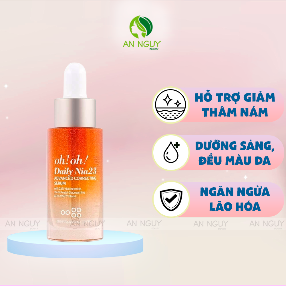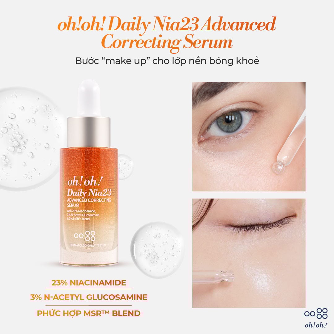 Tinh Chất Oh! Oh! Daily Nia23 Advanced Correcting Serum Dưỡng Sáng Da, Mờ Thâm là phiên bản nâng cấp hoàn hảo từ sản phẩm best-seller đình đám của oh!oh!, mang lại công thức đột phá với 23% Niacinamide, nồng độ cao nhất trên thị trường, kết hợp cùng 3% N-Acetyl Glucosamine và phức hợp Peptide MSR™ Blend độc quyền.