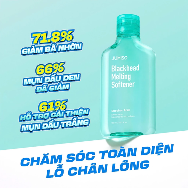 - Tinh Chất Ủ Mụn Jumiso Blackhead Melting Softener với thành phần chính là Succinic Acid và PHA nhẹ nhàng làm mềm và loại bỏ bã nhờn cứng đầu, kết hợp Cypress Water làm dịu da, đồng thời cung cấp độ ẩm cần thiết cho da.
