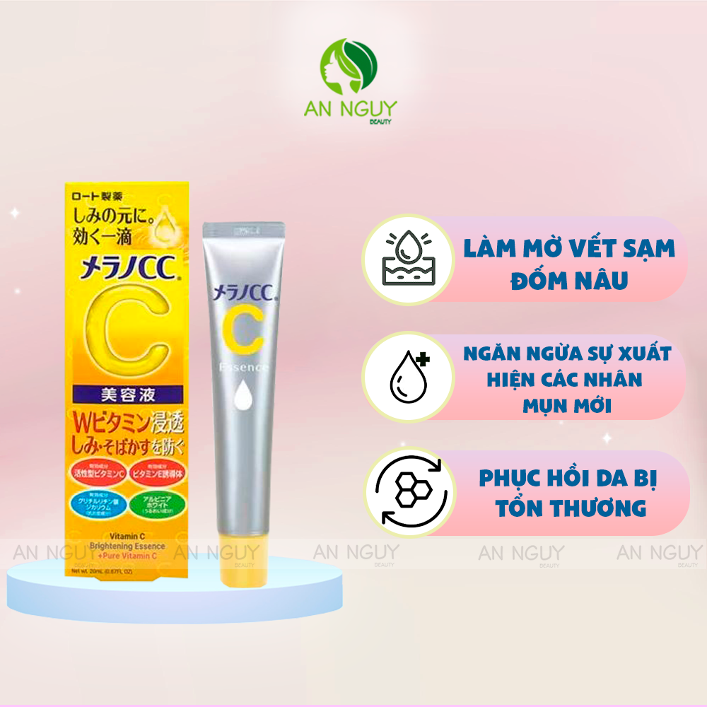 - Melano CC Vitamin C Brightening Essence là sản phẩm tinh chất dưỡng sáng da mờ thâm nám bán chạy nhất của thương hiệu Melano CC (Nhật Bản), với sự kết hợp giữa Vitamin C tinh khiết và Vitamin E có khả năng thẩm thấu sâu vào lớp đáy da làm giảm và ngăn ngừa vết thâm nám, tàn nhang, dưỡng da sáng mịn từ bên trong.