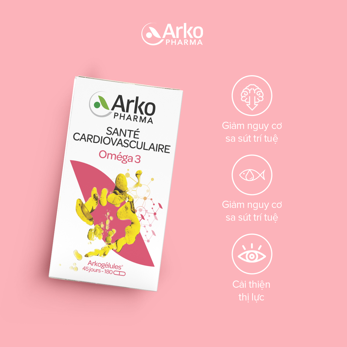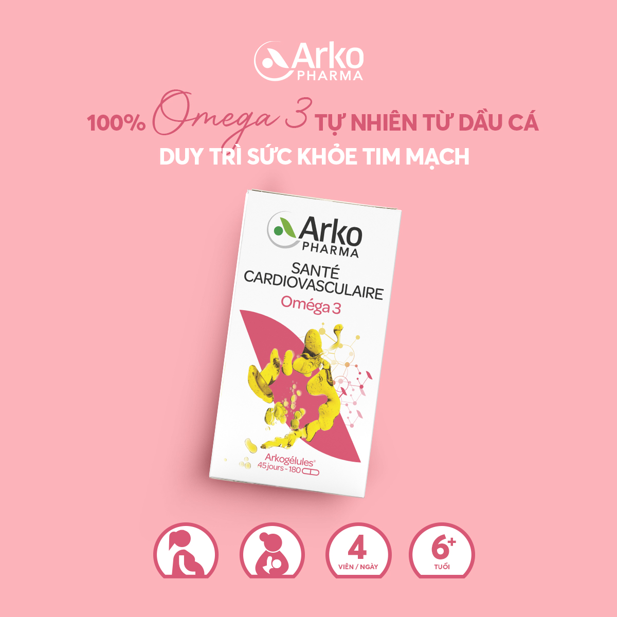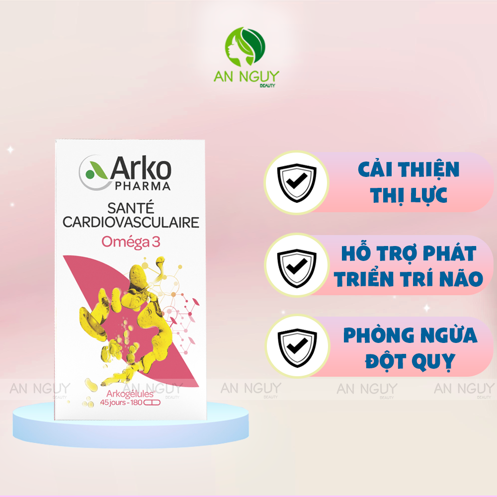 - Viên Uống Dầu Cá Arkopharma Arkogelules Omega 3 Hỗ Trợ Sức Khỏe Tim Mạch với công thức đặc biệt chứa dầu cá 100% tự nhiên từ cá hồi Na Uy, quy trình chiết xuất ở nhiệt độ rất thấp nên hạn chế quá trình oxy hóa axit béo, cung cấp axit omega 3 thiết yếu giúp duy trì sức khỏe tim mạch, phòng ngừa đột quỵ ở người lớn; hỗ trợ phát triển trí não và thị lực ở trẻ em.