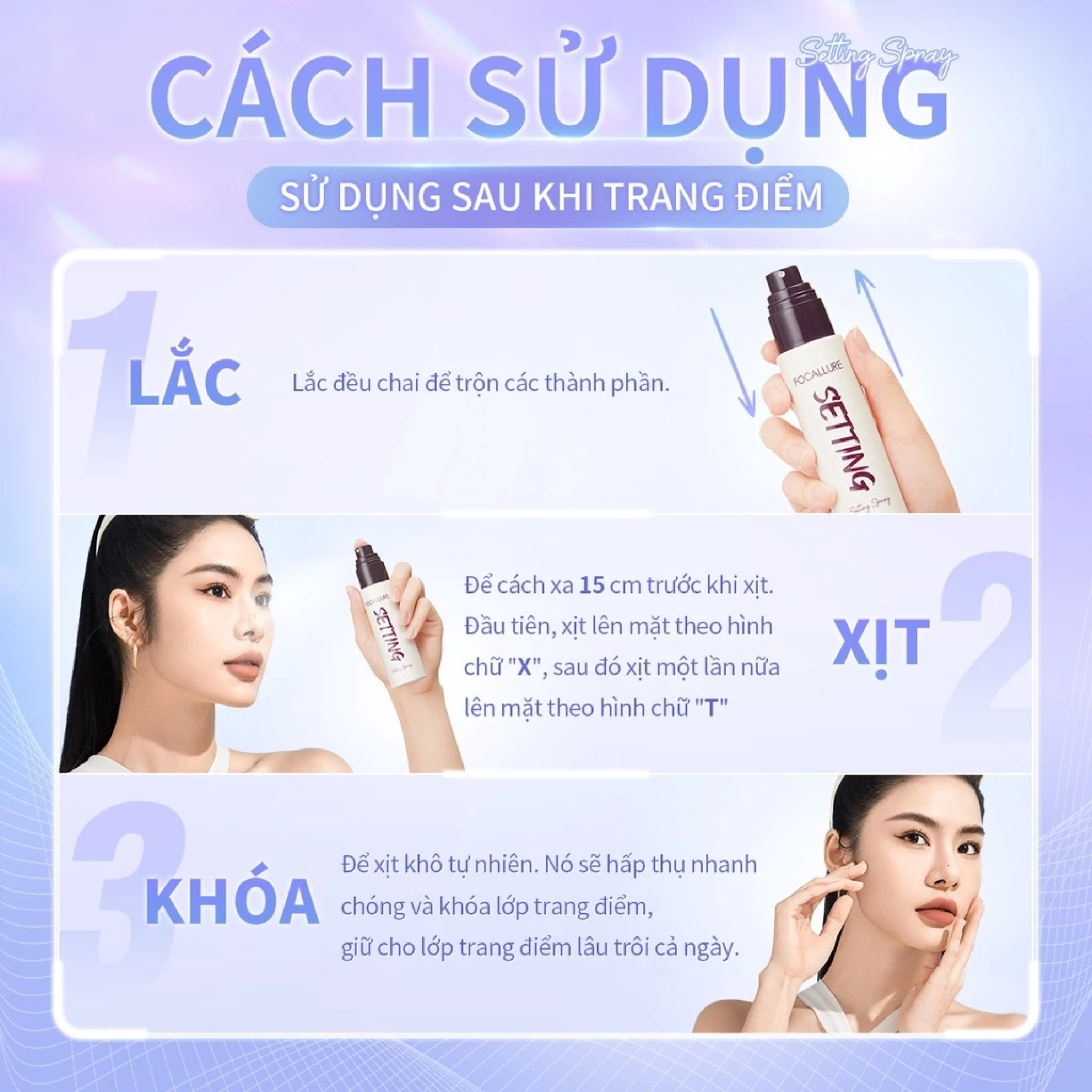 - Bước 3: Để xịt khô tự nhiên. Nó sẽ hấp thụ nhanh chóng và khóa lớp trang điểm, giữ cho lớp trang điểm lâu trôi cả ngày.