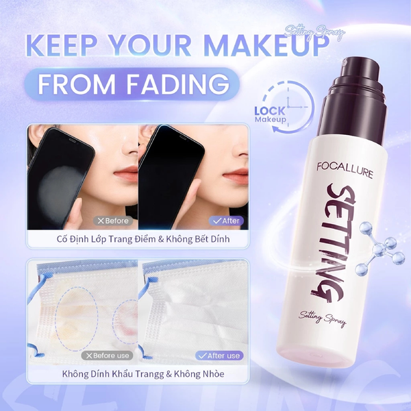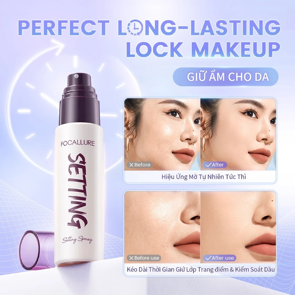 - Xịt Khóa Nền Cố Định Lớp Makeup Focallure Flawless Long-Lasting Setting Spray giúp khóa lớp trang điểm hỗ trợ giữ ẩm cho da, đồng thời kiểm soát dầu và hỗ trợ kiểm soát độ bóng trên bề mặt da.